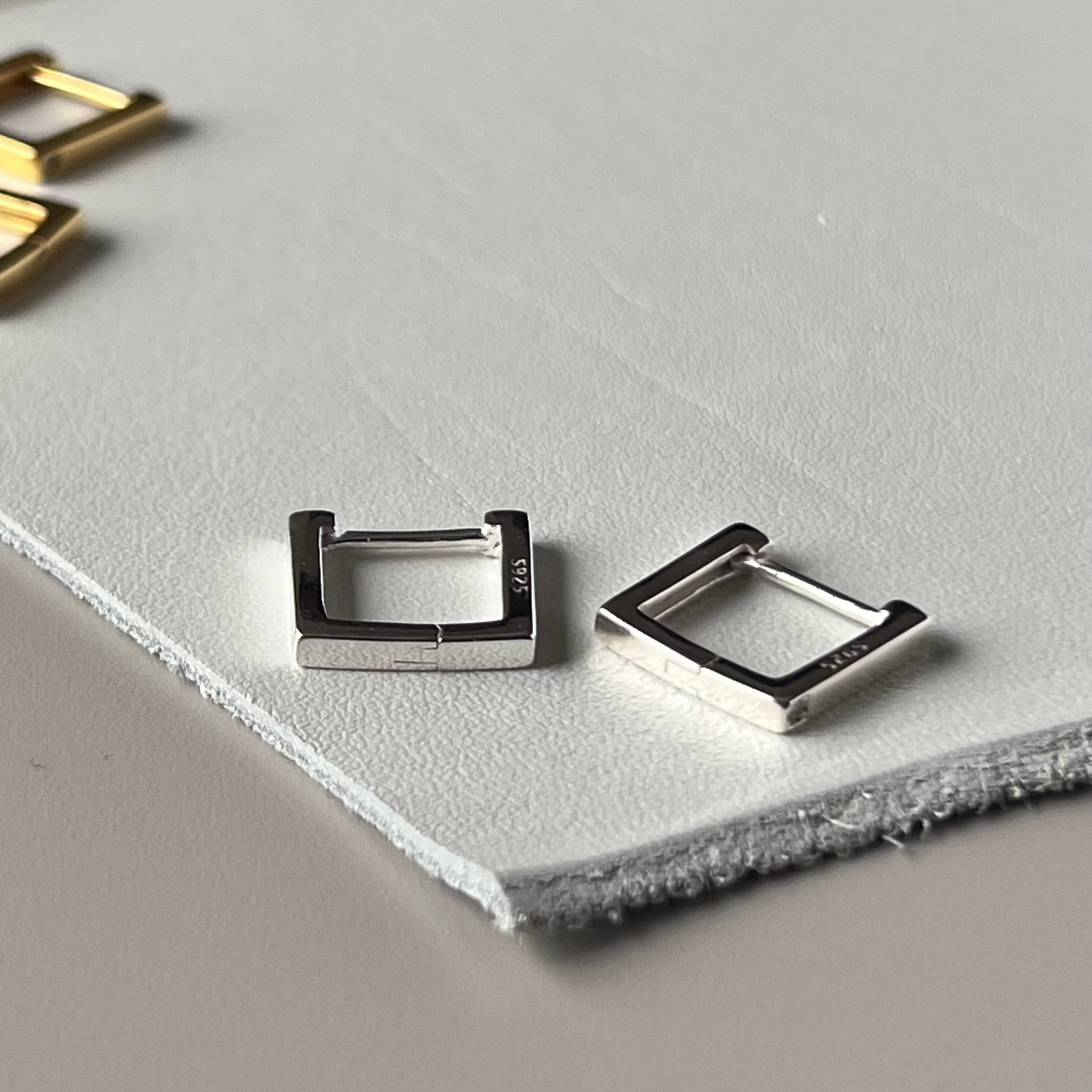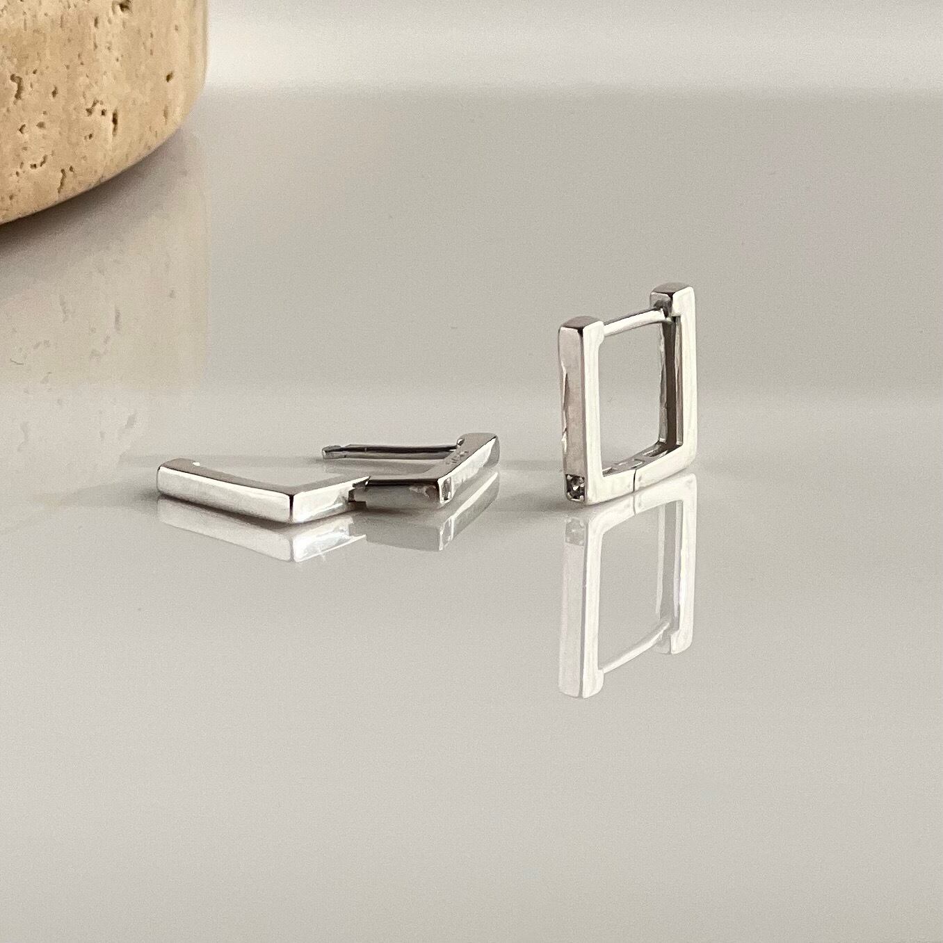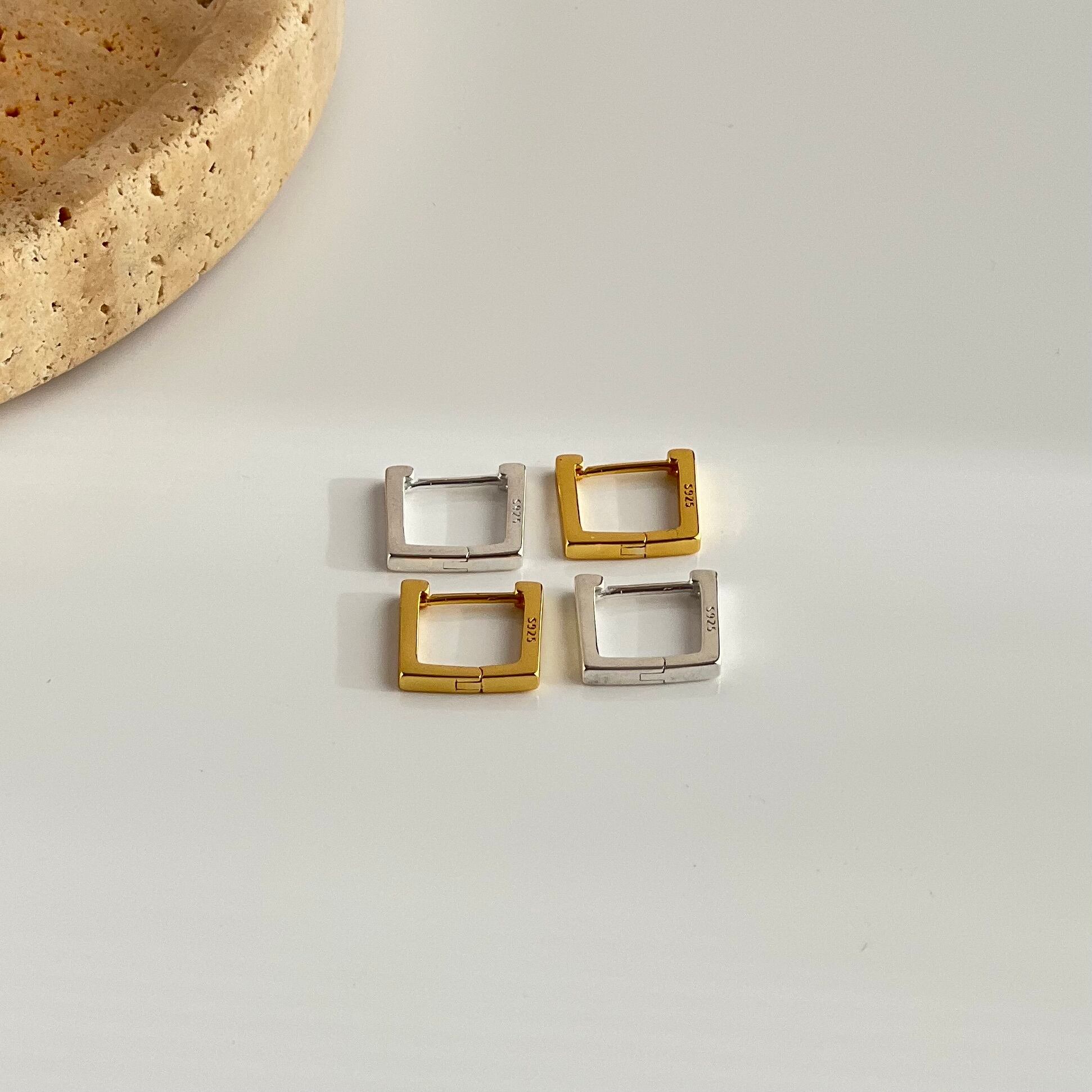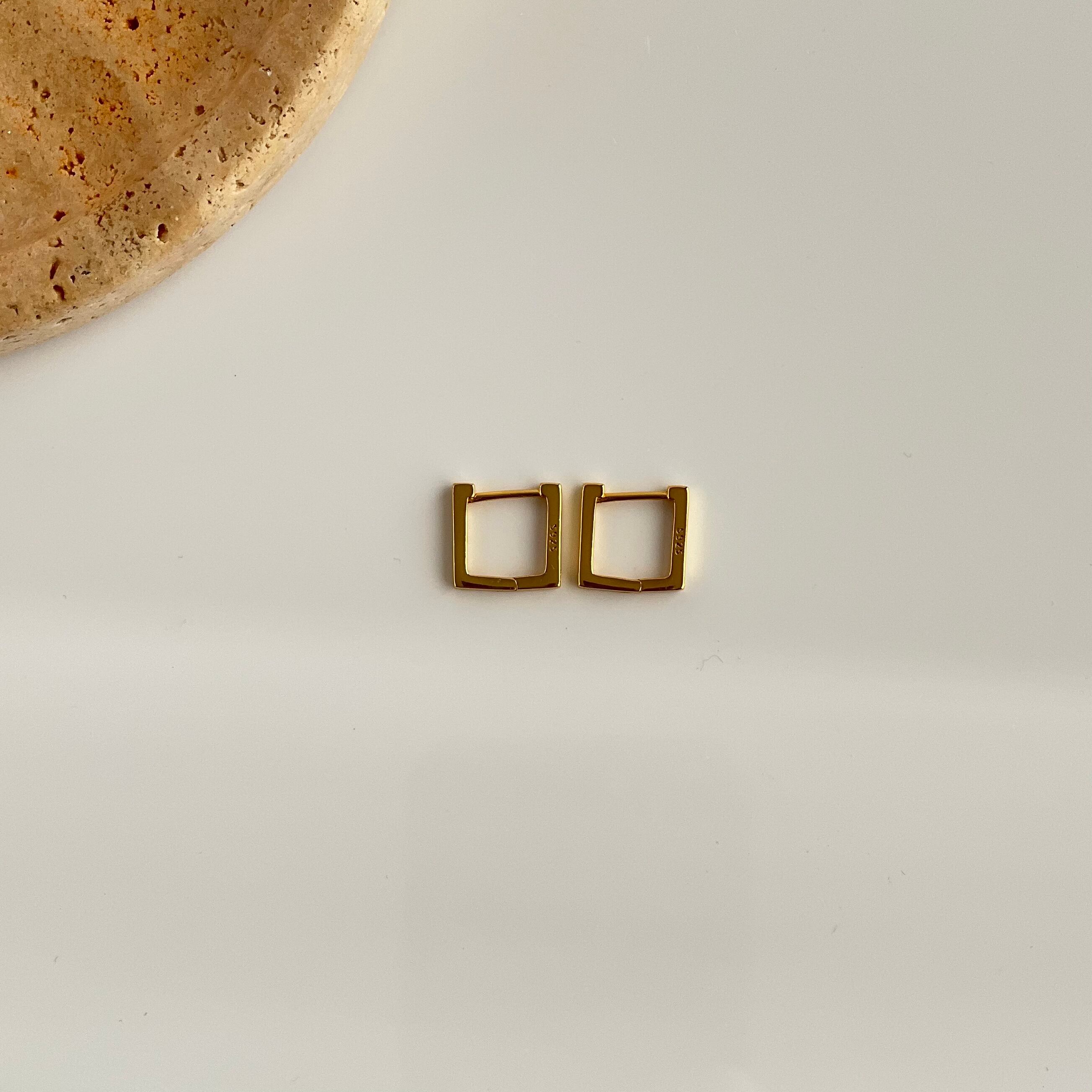 個性的な形のスクエアフープピアスを加え